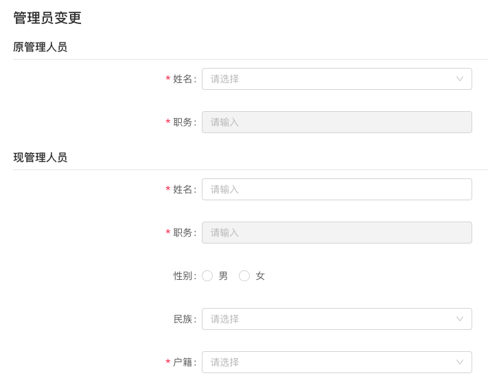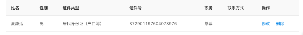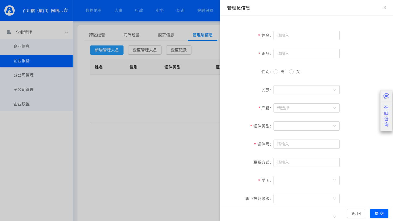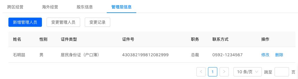 > 概述: 本文介绍如何进行管理人员信息的新增及变更。 页面路径:企业(左上角企业名称)—企业管理—企业报备—管理层信息 #### 新增管理人员 在页面中点击按钮,在打开的信息表单页面中录入管理层人员信息。  #### 修改/删除管理人员信息 点击相应管理人员记录后的操作按钮,可直接修改、删除相应记录。  #### 变更管理人员 管理人员变更时,需要变更管理人员的,需点击进入管理员变更页面,填写原管理人员、现管理人员信息提交即可。  变更提交后,可在列表中查看到最新的管理人员信息。
