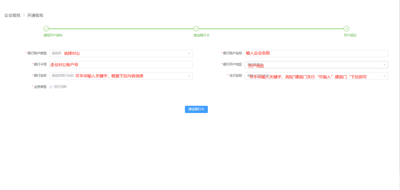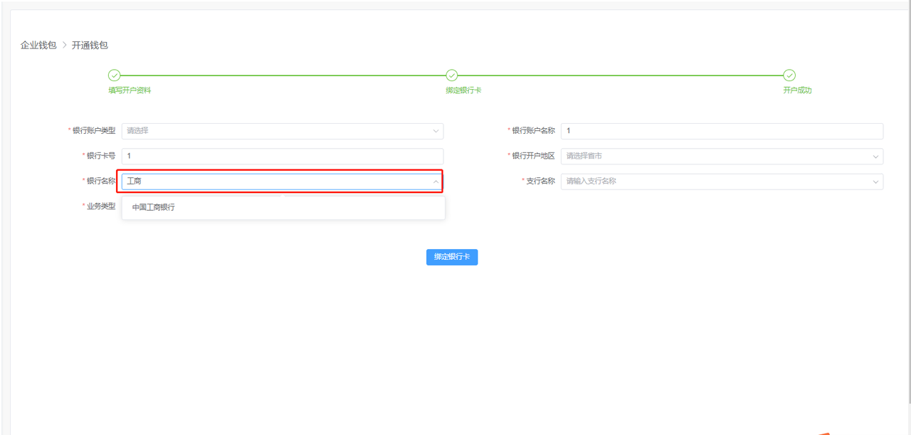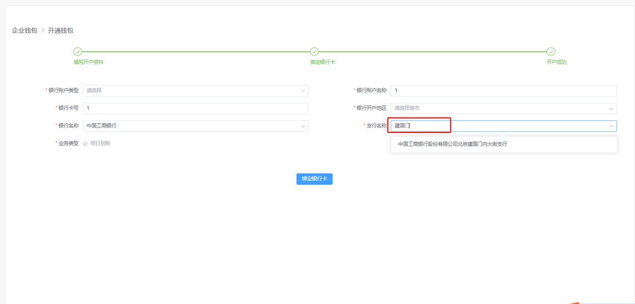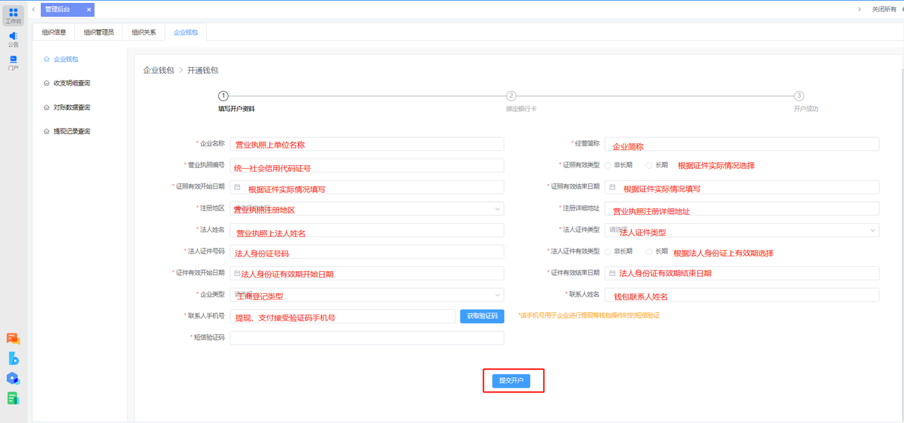 # 企业钱包开通 首先,点击左下角齿轮状按钮,进入【管理后台】,再点击【企业钱包】。  首次使用会进入到开通申请页面,可点击【企业钱包开通】查看指南,也可直接勾选“我已阅读并同意:支付服务协议”后点击【立即开通】进行钱包开通信息填写。  第一步“填写开户资料”,根据开通钱包企业的工商注册相关信息填写,其中“联系人手机号”将作为提现、支付等钱包操作接收验证码使用,开户资料填写完成点击【提交开户】。  进入到第二步“绑定银行卡”填写充值/提现使用的企业对公账户,这里绑定的公户不区分基本户或者一般户,其中“银行账户名称”填写的公司名称要与开户资料中填写的公司名称一致才可校验成功。  “银行名称”下拉为空,可输入关键字如“工商”即可通过下拉选择对应银行。  “支行名称”下拉为空,则可以输入关键字如“建国门支行”可输入“建国门”即可通过下拉选择对应支行。  银行信息填写完成后,点击【绑定银行卡】提示成功后,钱包开通成功,后续可根据钱包信息的“修改”按钮进行钱包开户信息和钱包绑定对公账户的修改。